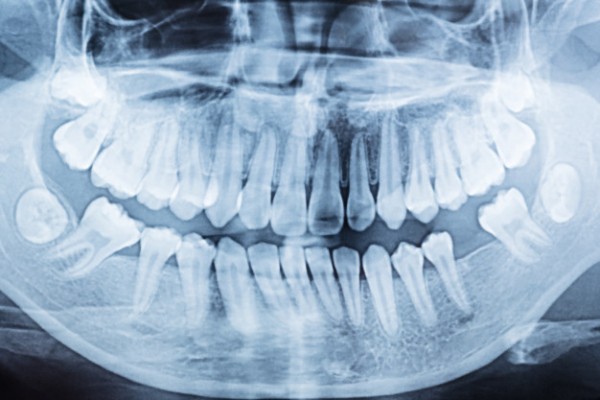 Radiografía panorámica que mnuestra el tercer molar extraido por cirugía.